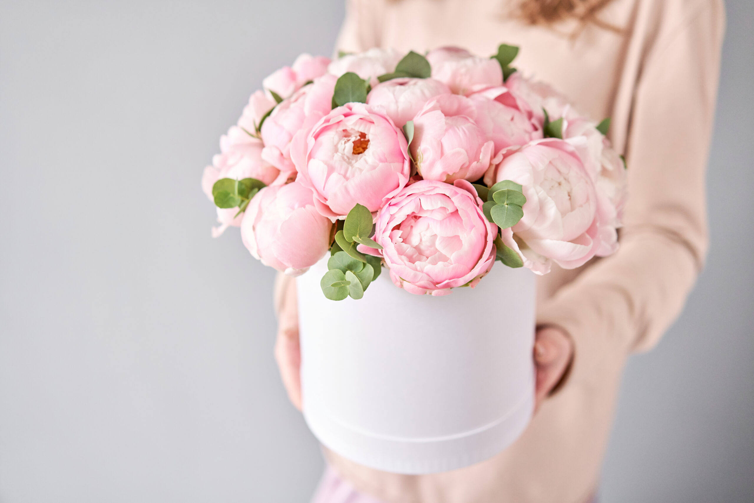 A special gift with Round Box with Bouquet of Pink Peonies.